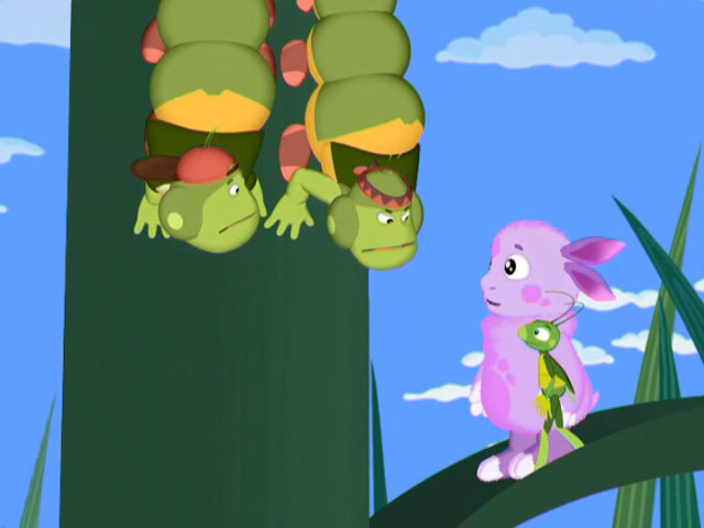 Лунтик с Кузей думают, что в тростнике сидит жучок, играющий на дудочке, но оказалось, что это ветер.