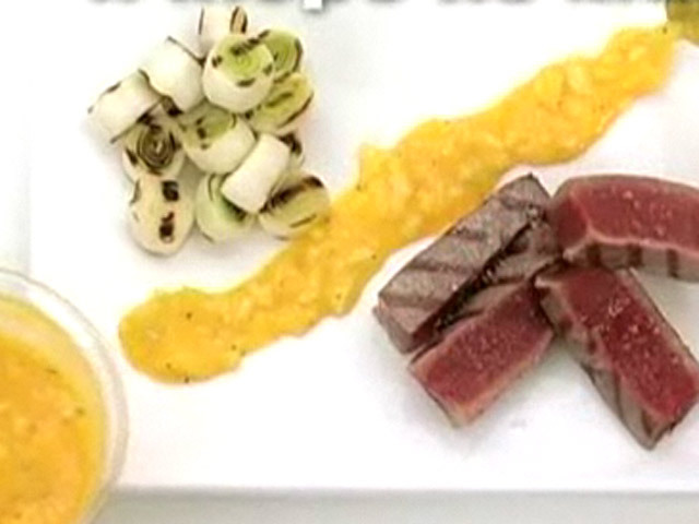 Низкокалорийный рецепт тунца с пюре из манго. 273 калории.Состав:порей — 1 стебль;манго — 50 гр;тунец — 100 гр;соевый соус, оливковое масло, имбирь, черный перец, соль. Язык: Русский